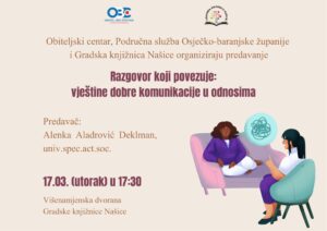 Obiteljski centar, Područna služba Osječko-baranjske županije u suradnji s Gradskom knjižnicom Našice vas pozivaju na predavanje 𝐑𝐚𝐳𝐠𝐨𝐯𝐨𝐫 𝐤𝐨𝐣𝐢 𝐩𝐨𝐯𝐞𝐳𝐮𝐣𝐞: 𝐯𝐣𝐞𝐬̌𝐭𝐢𝐧𝐞 𝐝𝐨𝐛𝐫𝐞 𝐤𝐨𝐦𝐮𝐧𝐢𝐤𝐚𝐜𝐢𝐣𝐞 𝐮 𝐨𝐝𝐧𝐨𝐬𝐢𝐦𝐚, predavačice