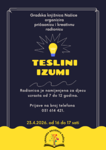 Povodom Noći knjige 2026. organiziramo pričaonicu i kreativnu radionicu za uzrast od 7 do 12 godina pod nazivom: 💡⚡️ TESLINI IZUMI💡⚡️ 💡 23.04.2026. ⚡️16:00-17:00 Prijave na: