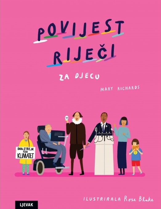 Povijest riječi za djecu (Mary Richards Rose Blake) – Od samih početaka jezika ljudi su izumili bezbroj načina sporazumijevanja s pomoću riječi. Od hijeroglifa do haikua, od znakovnog jezika do Shakespearea, jezik je ključan u razmjeni ideja. Upoznajte ljude iz cijeloga svijeta poznate po vještom baratanju riječima i otkrijte kako se i vi možete poslužiti riječima kako bi svijet postao bolji.