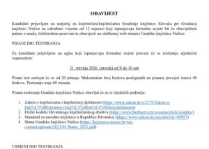 Kandidati prijavljeni na natječaj za knjižničara/knjižničarku Središnje knjižnice Slovaka pri Gradskoj knjižnici Našice na određeno vrijeme od 12 mjeseci koji