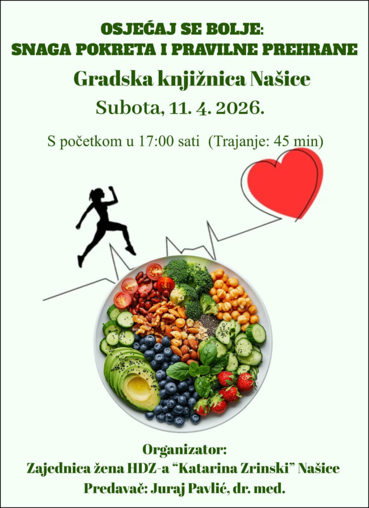 ozivamo vas na zanimljivo predavanje koje će se održati u subotu 11. travnja 2026. godine pod nazivom “Osjećaj se bolje: snaga pokreta i pravilne prehrane”.